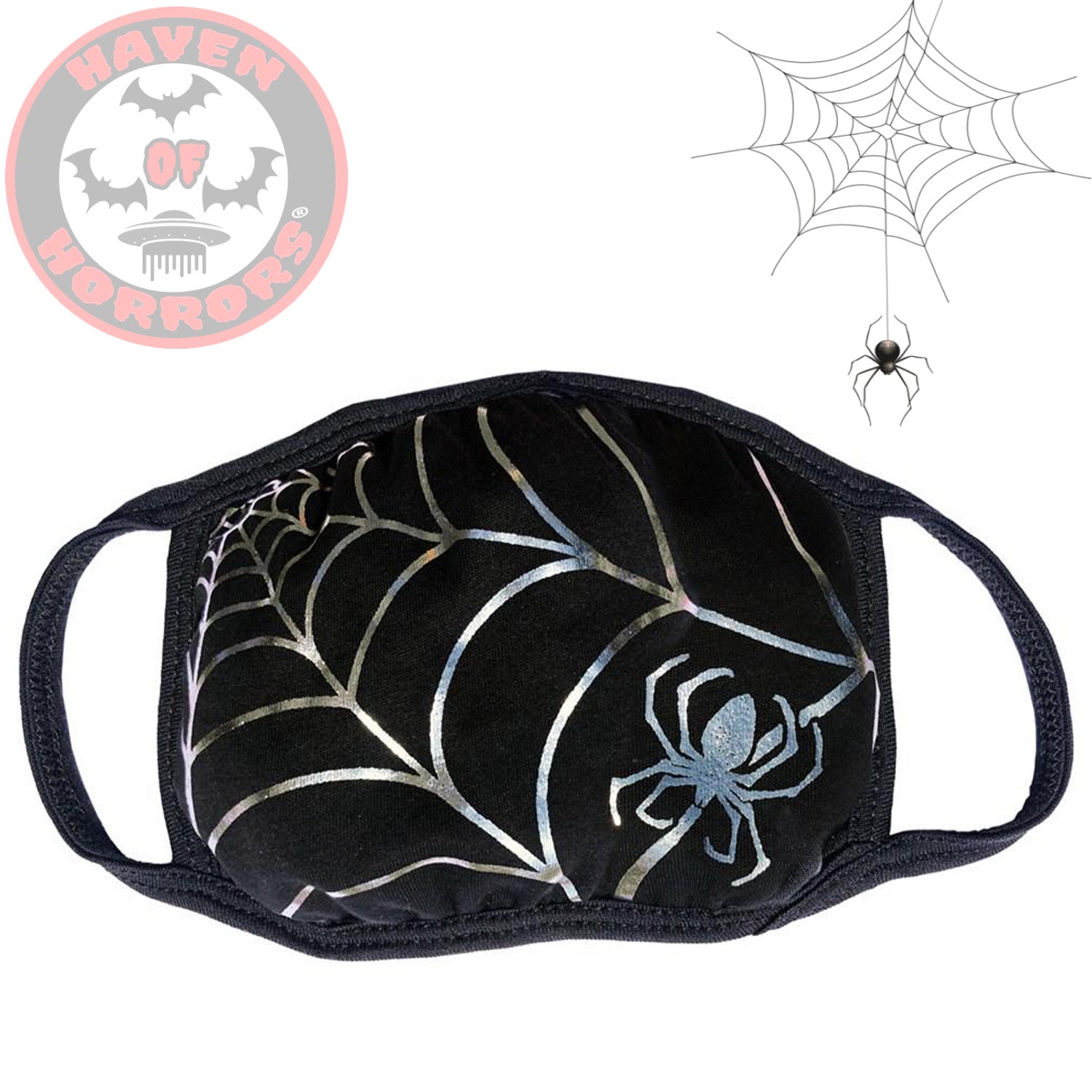 Kreepsville "Spiderweb Silver Foil" Mask fabric face covering. These non-medical face coverings are double layered cotton fabric, washable and re-useable. Cotton bands that fit comfortably over the ears.