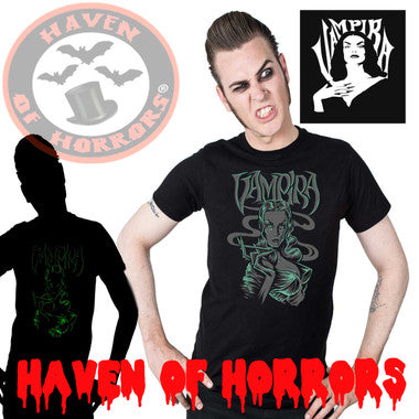 Be the coolest creep with our Vampira Smokin Glow Tee by Kreepsville! Featuring a spooky glow-in-the-dark print, this soft and comfortable 100% cotton t-shirt will make you stand out from the crowd (bonus points for wearing it in the dark!).