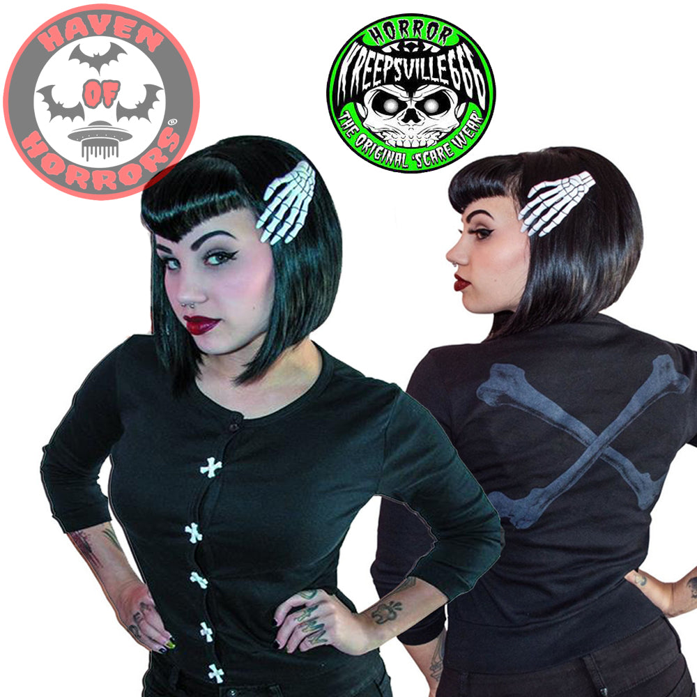Kreepsville 666 cropped cardigan with 3|4 sleeve detail, lightweight 100% cotton with screened crossbones on back and custom kreepsville 666 crossbones buttons. Another layer to wear while prowling around you lair.